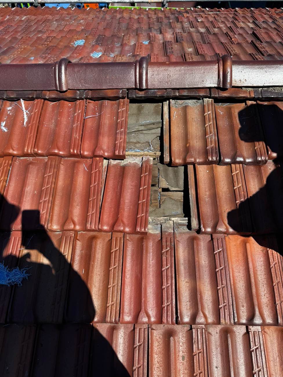 屋根に上がってみると瓦のズレや割れが目立ち、表面の劣化も進んでいたため、雨漏りの原因が複数重なっている状態でした。